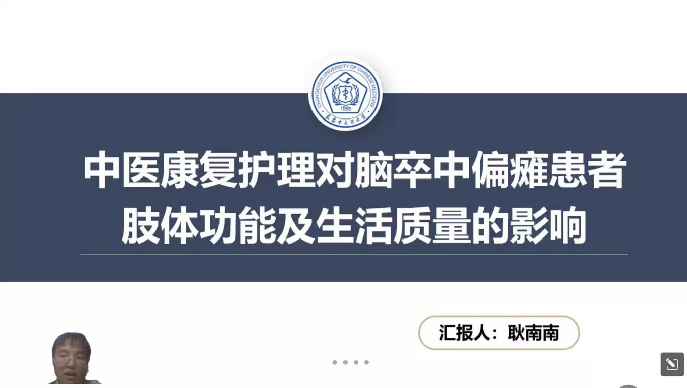 耿南南以《中医康复护理对脑卒中偏瘫患者的影响》为主题进行分享,阐述了坐式八段锦、中药热敷、按摩等中医康复护理技术在改善脑卒中偏瘫患者肢体运动功能和提高生活质量中的应用。未来该领域可围绕突出康复护理特色,构建多团队合作,深入探索作用机制等开展研究,以优化临床干预效果。
