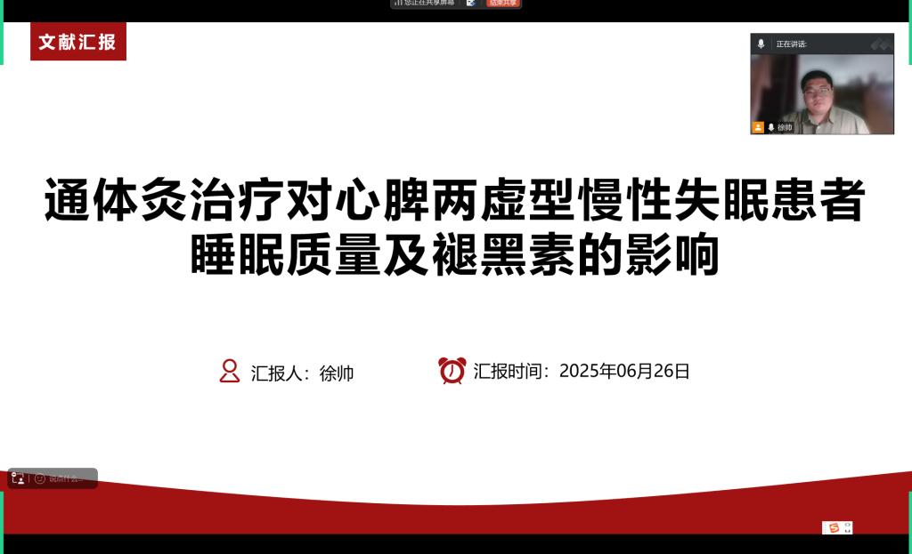 徐帅介绍通体灸疗法可改善心脾两虚型患者的睡眠、情绪等问题,其作用机制可能与升高患者血清褪黑素水平有关,为慢性失眠患者的中医护理提供了依据。