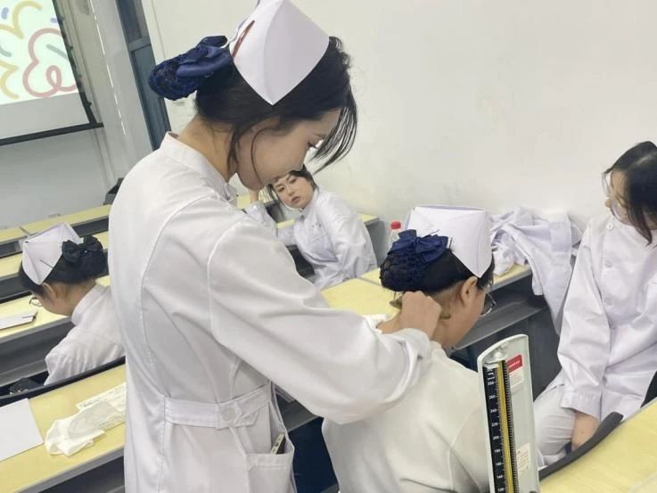 本次培训主要包括四部分内容,分别是中医穴位辨识、基础按摩推拿示教、血压测量和刮痧。薛志龙同学讲解如百会穴、阿是穴等中医常用保健穴位的定位方法及主治功效,及一种家庭保健揉腹手法。曲子涵同学现场详细演示并讲解基础按摩推拿的操作手法。胡双同学围绕刮痧的部位、力度和手法进行了重点讲解,同时还介绍了血压计的使用方法及相关注意事项。主讲团队在学员们分组实操模拟时针对学员们在操作过程的难点和易错点进行纠正,确保正确掌握培训内容。